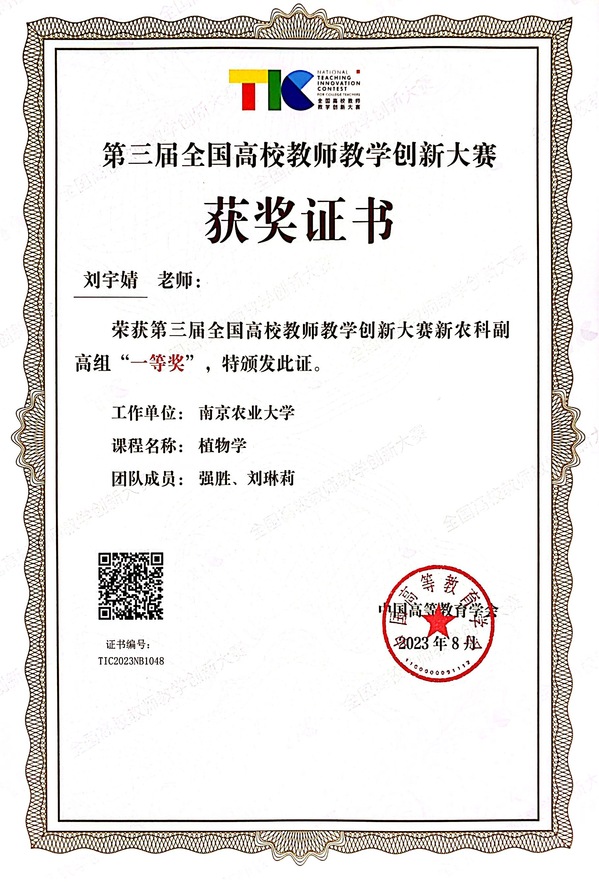 领奖环节(左三为刘宇婧副教授)刘宇婧副教授团队主讲的《植物学》是面向生命科学领域专业大一学生开设的一门专业必修课。在本次大赛中,她全面阐述了三代人在《植物学》教学过程中 “从‘心’出发,打造沉浸式高效课堂”的教学创新成果。通过贯彻以学生发展为中心的教学理念,顺应新农科发展趋势和要求,从教学内容、教学资源、教学方式、教学评价等方面进行改革实践,构建了“生临其境、植入人心、物我相融,知行合一”沉浸式高效课堂的探索过程和取得的成果,现场汇报全面系统,有理有据,深入浅出,获得评委的一致好评。植物学课程教学团队在国家教学名师强胜教授带领下,长期坚持课程现代化建设,引领课程教学模式改革方向,先后获得首批国家精品课程、国家精品资源共享课程、国家线上和线上线下一流课程、国家课程思政示范课程,课程建设和改革成果先后获国家教学成果二等奖、省特一等奖3项,主编的植物学教材获首批国家优秀教材二等奖。此次获奖也是该课程不断加强团队建设的具体体现。