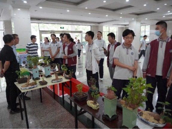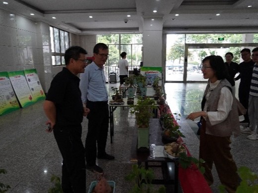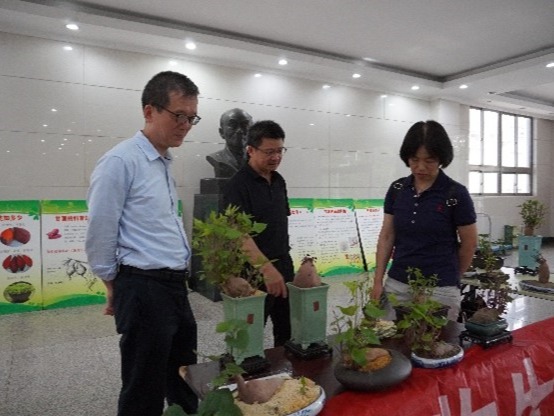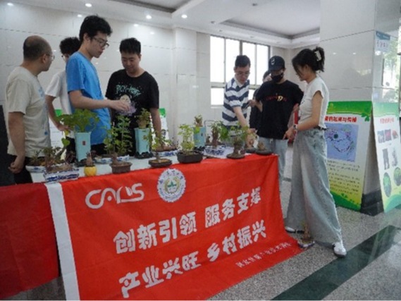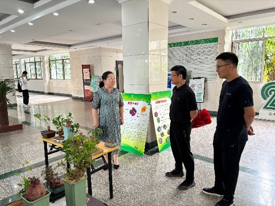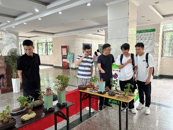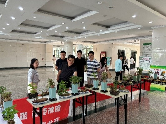 活动现场甘薯盆景错落有致,每一个盆景恰如一幅画:取法自然,高于自然,疏林叠翠,云崖竞秀,情景相融,气韵自生。活动伊始便迎来诸多老师和学生们的驻足观赏。大家或拍照留念,或沉浸于咫尺山林,或谈论甘薯的康养价值,或谈论甘薯的经济和观赏价值,现场热闹非凡,参观者无不惊羡于甘薯盆栽的创意与欣赏价值。此外,团队成员还利用该盆景展览机会,与师生广泛交流了有关开发利用盐碱地资源、国家粮食安全、科技助力乡村产业发展、参与和美乡村建设、乡村文旅活动、国家甘薯产业技术体系等很多方面的内容,大力推广和宣传甘薯的科普知识及保健作用,宣讲甘薯产业在国民经济中的重要价值。