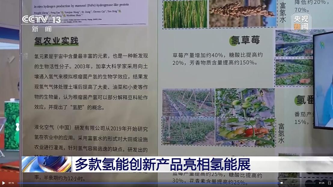 2025年3月26日-28日,第四届中国国际氢能及燃料电池产业博览会在北京召开。2025年3月28日央视新闻频道(朝闻天下)在展会现场报道了由3044am永利集团3044noc沈文飚教授氢气生物学研究团队提供专利技术支持的氢农业产品,包括氢大米、氢草莓、氢番茄和氢蓝莓等。富氢水灌溉不仅显著提高了农产品的产量、提升了品质,并且降低了农药残留。