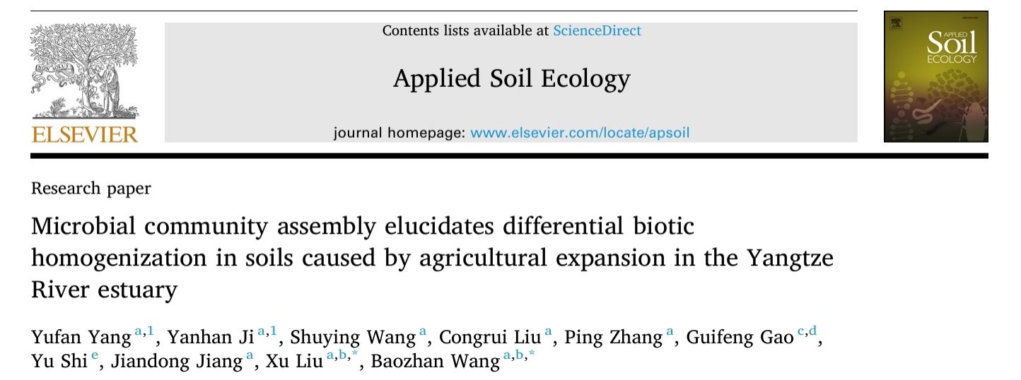 近日,永利集团官网2024级直博生杨雨凡以第一作者身份在土壤科学领域知名期刊Applied Soil Ecology(JCR Q1)发表题为“Microbial community assembly elucidates differential biotic homogenization in soils caused by agricultural expansion in the Yangtze River estuary”的研究论文,取得重要科研进展,体现了永利集团官网“本博贯通”培养模式的初步成效。