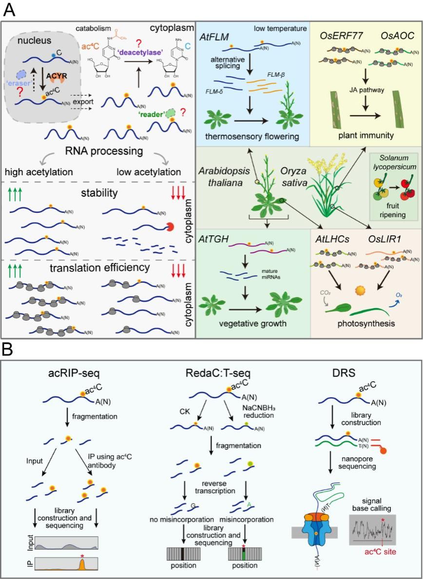 在生物学功能方面,文章深入阐述了ac4C通过调控mRNA稳定性、翻译效率及可变剪接等在植物发育与逆境适应中发挥的关键作用(图1A)。叶片发育进程中,ac4C修饰通过提升TGH转录本的稳定性,保障miRNA的稳态,从而促进叶片形态建成;果实发育过程中,ac4C修饰呈现动态变化特征,参与调控乙烯合成及信号转导基因的表达,影响番茄果实成熟与品质。ac4C修饰还被证实是植物应对环境变化的核心调节枢纽:在光合作用过程中,该修饰特异性富集于光合相关转录本,通过提升捕光复合物(AtLHCs)及OsLIR1等转录本的翻译效率或稳定性来维持高光合效能;在感温开花调控中,低温诱导的特异性ac4C修饰通过阻碍剪接因子SF1的结合,改变开花抑制因子FLM的可变剪接模式,决定低温环境下拟南芥的开花时间;在植物免疫反应中,病原菌侵染可诱导宿主植物mRNA乙酰化丰度显著上升,通过特异性提升茉莉酸信号通路关键转录本(如OsERF77和OsAOC)的翻译效率来增强植物的抗病能力。
