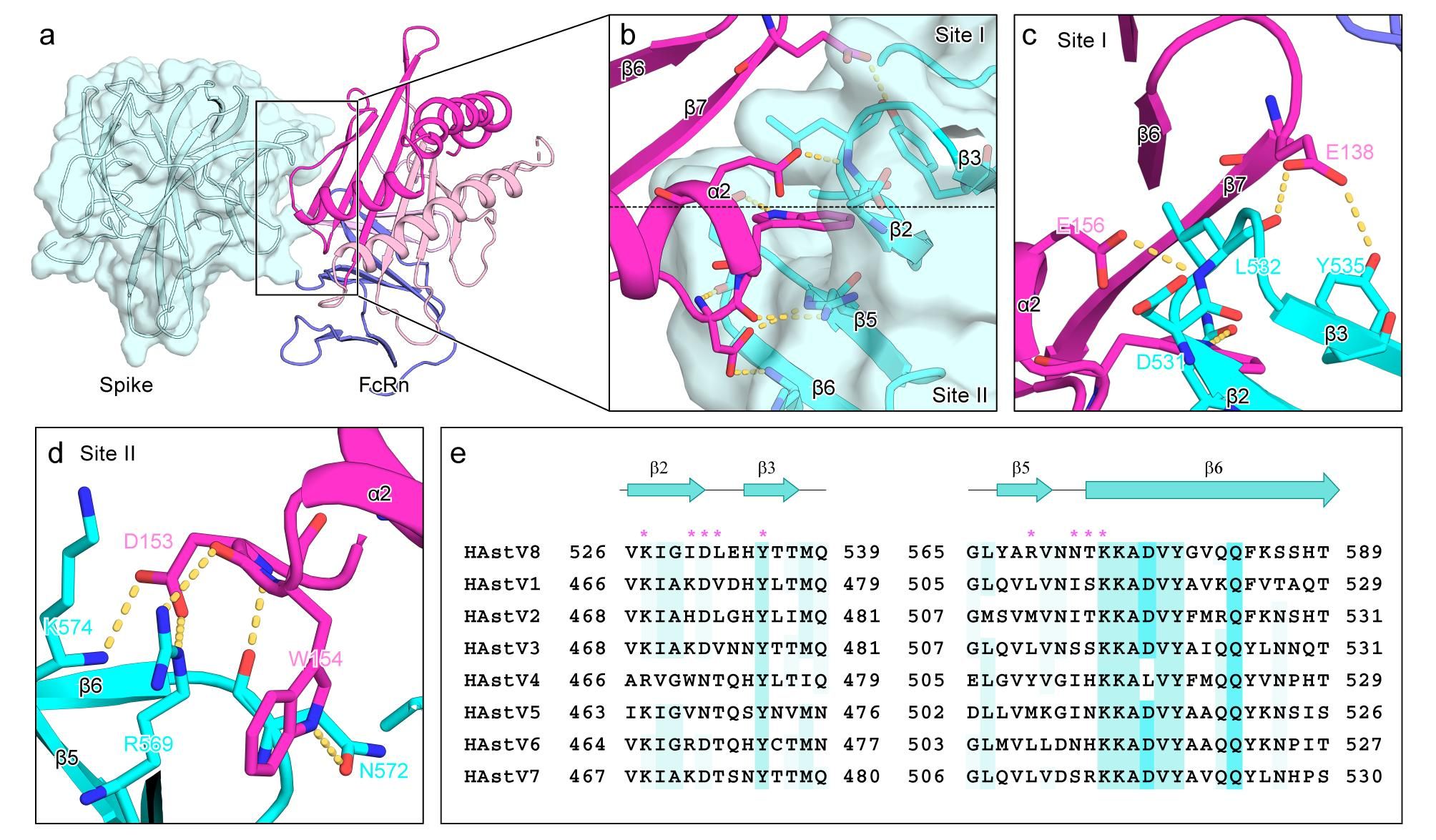 图1 HAstV8刺突蛋白通过由四条β链(β2、β3、β5和β6)形成的表面凹陷结构,与FcRn的α2结构域结合