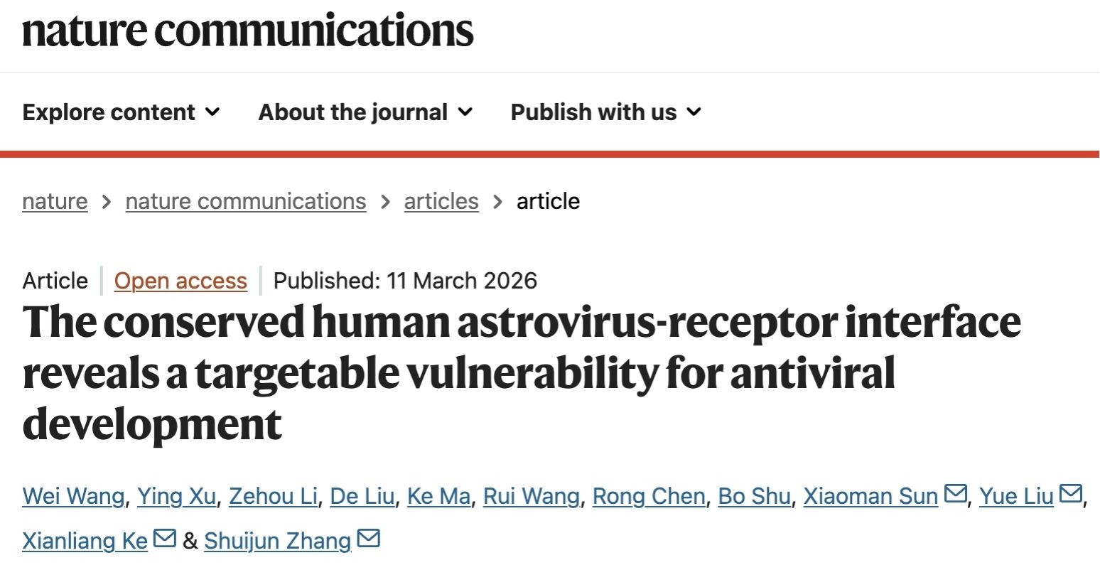 2026年3月11日,我校3044am永利集团3044noc张水军教授课题组在《Nature Communications》期刊在线发表了题为《The conserved human astrovirus-receptor interface reveals a targetable vulnerability for antiviral development》的研究论文。该研究首次解析了人星状病毒8型(HAstV8)刺突蛋白与FcRn受体的复合物晶体结构,揭示了经典人星状病毒识别受体的保守分子机制,更重要的是,研究发现三款临床已获批的FcRn阻断剂能够通过竞争受体结合有效抑制星状病毒感染,有望通过“老药新用”的策略用于星状病毒治疗。