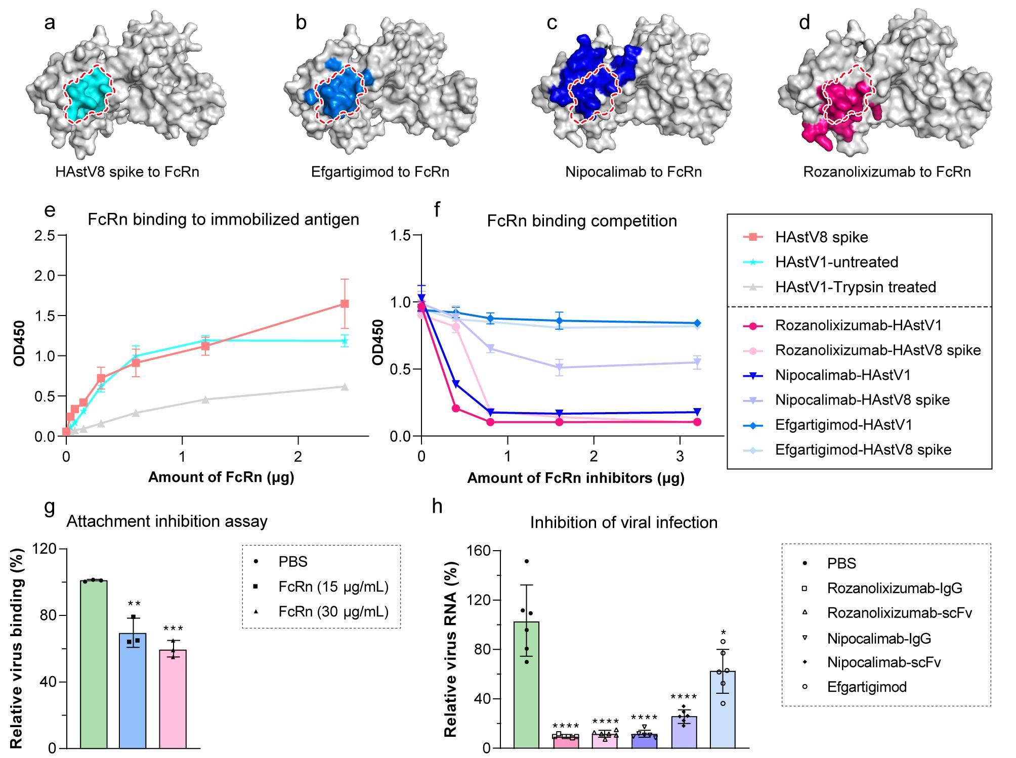 值得注意的是,HAstV8刺突蛋白与三种临床获批用于治疗重症肌无力的FcRn阻断剂在FcRn上的结合位点高度重叠,为开发抗广谱病毒药物奠定了结构基础。基于这一结构发现,研究团队进一步评估了三种临床获批用于治疗重症肌无力的FcRn阻断剂—efgartigimod、rozanolixizumab和nipocalimab的抗病毒效果。实验结果表明,rozanolixizumab和nipocalimab能高效竞争性抑制星状病毒与FcRn的结合,显著阻断病毒对易感Caco2细胞的感染,使细胞内病毒RNA水平降低约90%;efgartigimod也表现出一定的抗病毒活性(图2)。这一发现证实了临床获批的FcRn阻断剂具有抑制星状病毒感染的潜力,为星状病毒感染的治疗提供了可直接进行临床转化的候选药物。